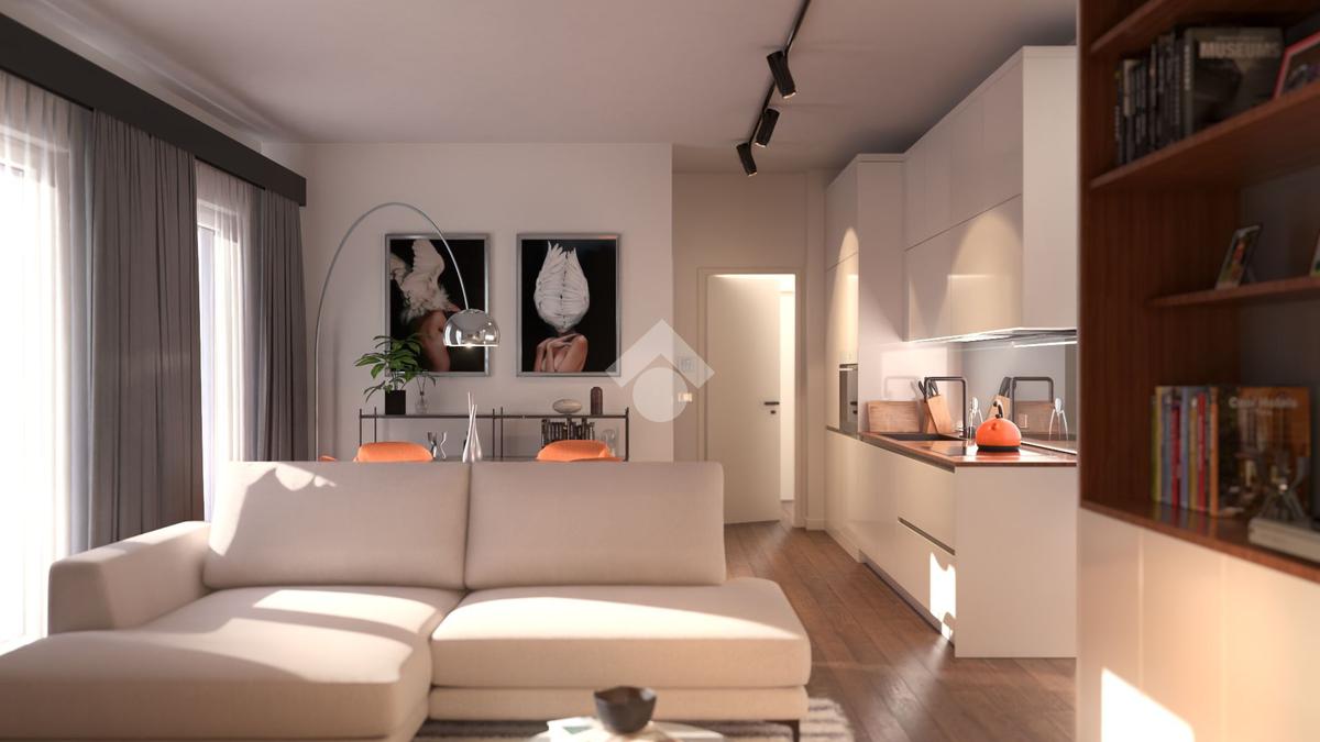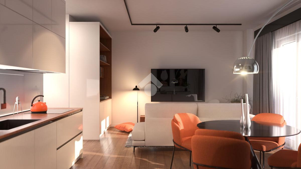 zona giorno, che si apre ingresso su una cucina-soggiorno molto luminosa con accesso al balcone, ed un servizio igienico, mentre la zona notte offre due camere da letto di cui una con servizio igienico in camera.